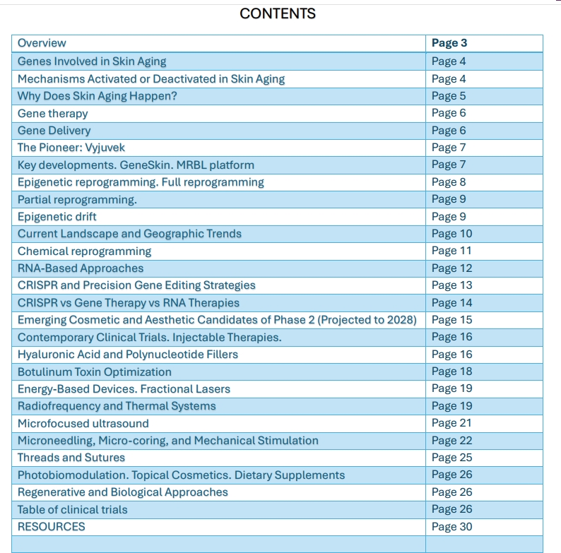 • Gene Therapy Exploration of viral vector platforms (HSV-1 dominance, AAV limitations), successes in genodermatoses (Vyjuvek, Zevaskyn), and emerging aesthetic candidates (KB301/KB304). Includes preclinical highlights like GeneSkin (mRNA-based) and the MRBL platform.