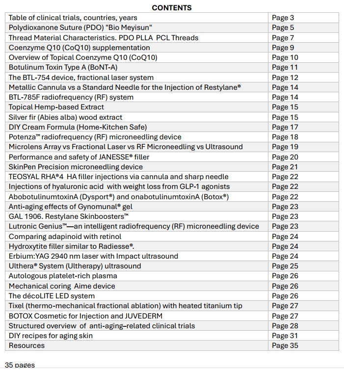 Skin aging is characterized by visible changes such as wrinkles, fine lines, loss of elasticity, pigmentation irregularities, and textural unevenness. Over the past two decades (2005–2025), advancements in aesthetic medicine have introduced a wide spectrum of therapies—including botulinum toxins, dermal fillers, mechanical and energy-based devices (e.g., lasers, radiofrequency, ultrasound), regenerative approaches (such as PRP and stem cell-derived therapies), and topical or systemic agents (including peptides like Argireline and Decorinyl, niacinamide, antioxidants, and nutraceuticals). These innovations target diverse mechanisms of intrinsic and extrinsic aging, enabling personalized treatment plans that optimize efficacy, minimize downtime, and align with individual patient goals.