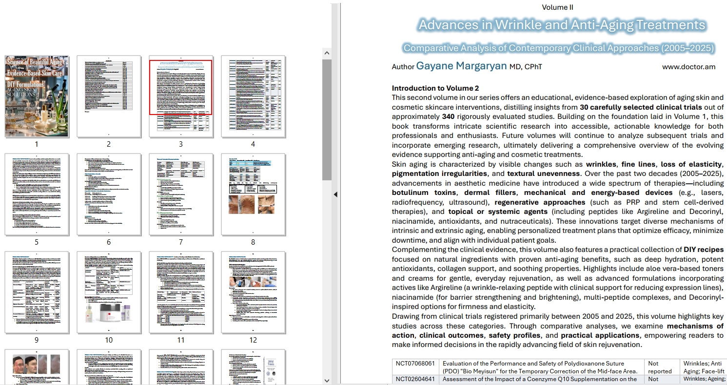 This second volume in our series offers an educational, evidence-based exploration of aging skin and cosmetic skincare interventions, distilling insights from 30 carefully selected clinical trials out of approximately 340 rigorously evaluated studies. Building on the foundation laid in Volume 1, this book transforms intricate scientific research into accessible, actionable knowledge for both professionals and enthusiasts. Future volumes will continue to analyze subsequent trials and incorporate emerging research, ultimately delivering a comprehensive overview of the evolving evidence supporting anti-aging and cosmetic treatments.