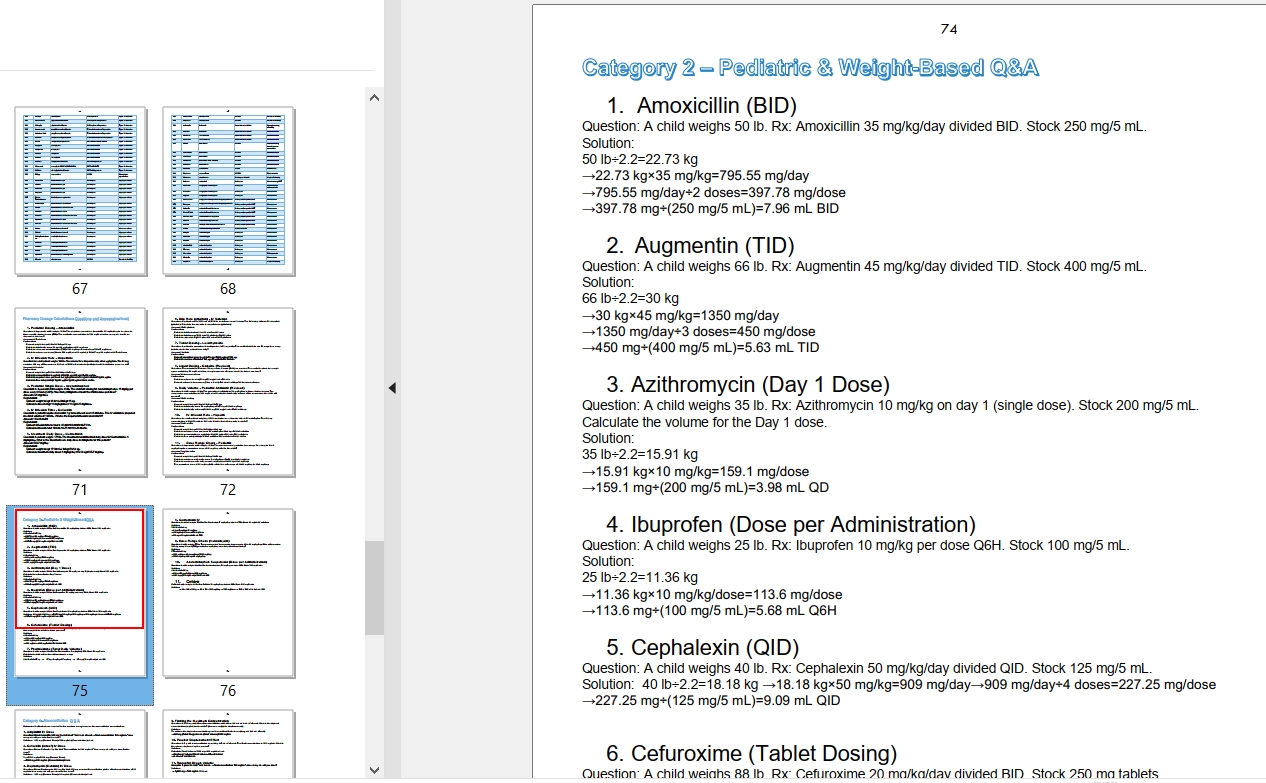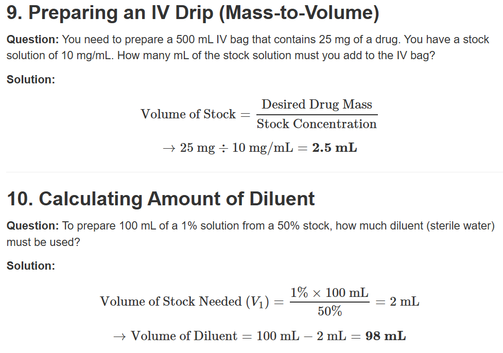 Formulas + 123+ practice questions broken into categories (Desired/Have, Pediatric, IV rates, Reconstitution, BSA, Dilution, Alligation) with step-by-step answers and one-sentence explanations.