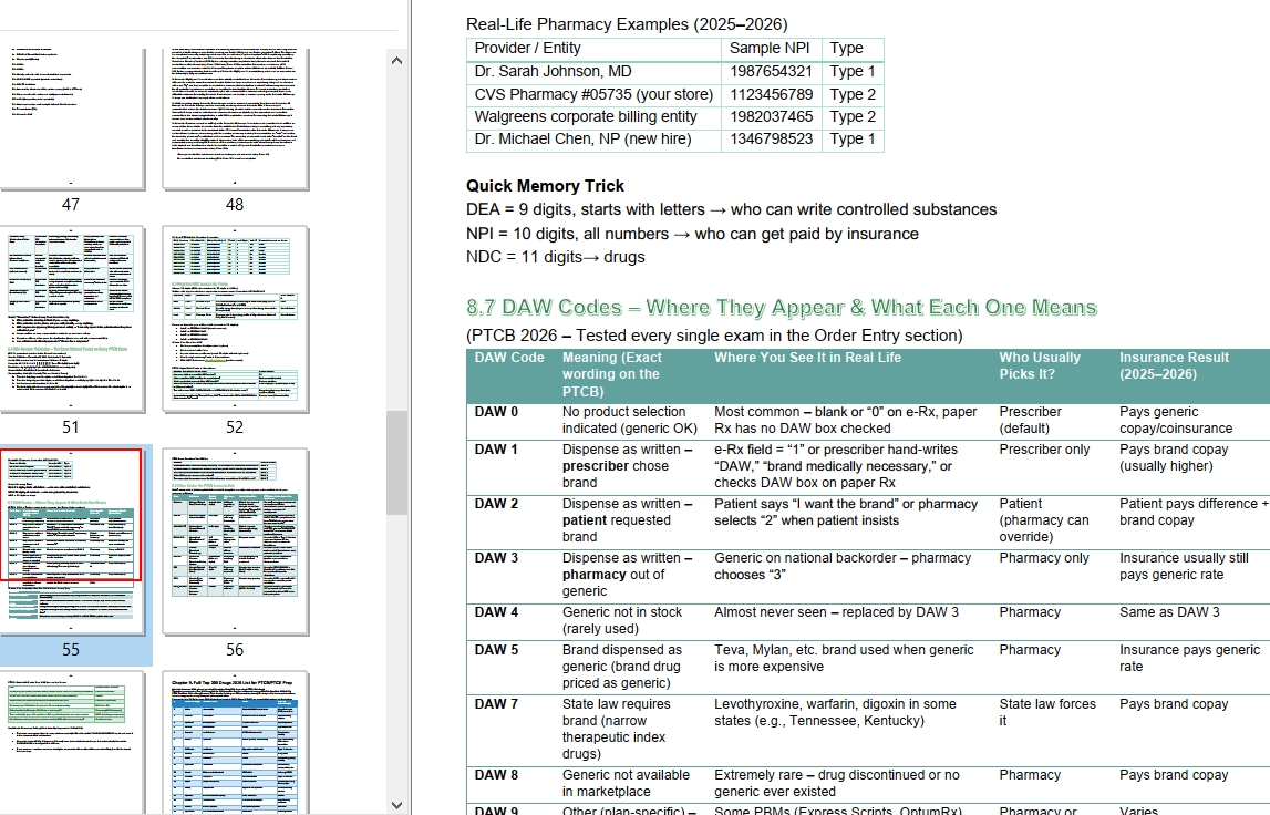 DEA number validation (the exact math they test), NDC breakdown, DAW codes 0–11, NPI, adverse event reporting (MEDWATCH, VAERS), pharmacy communication rules.
