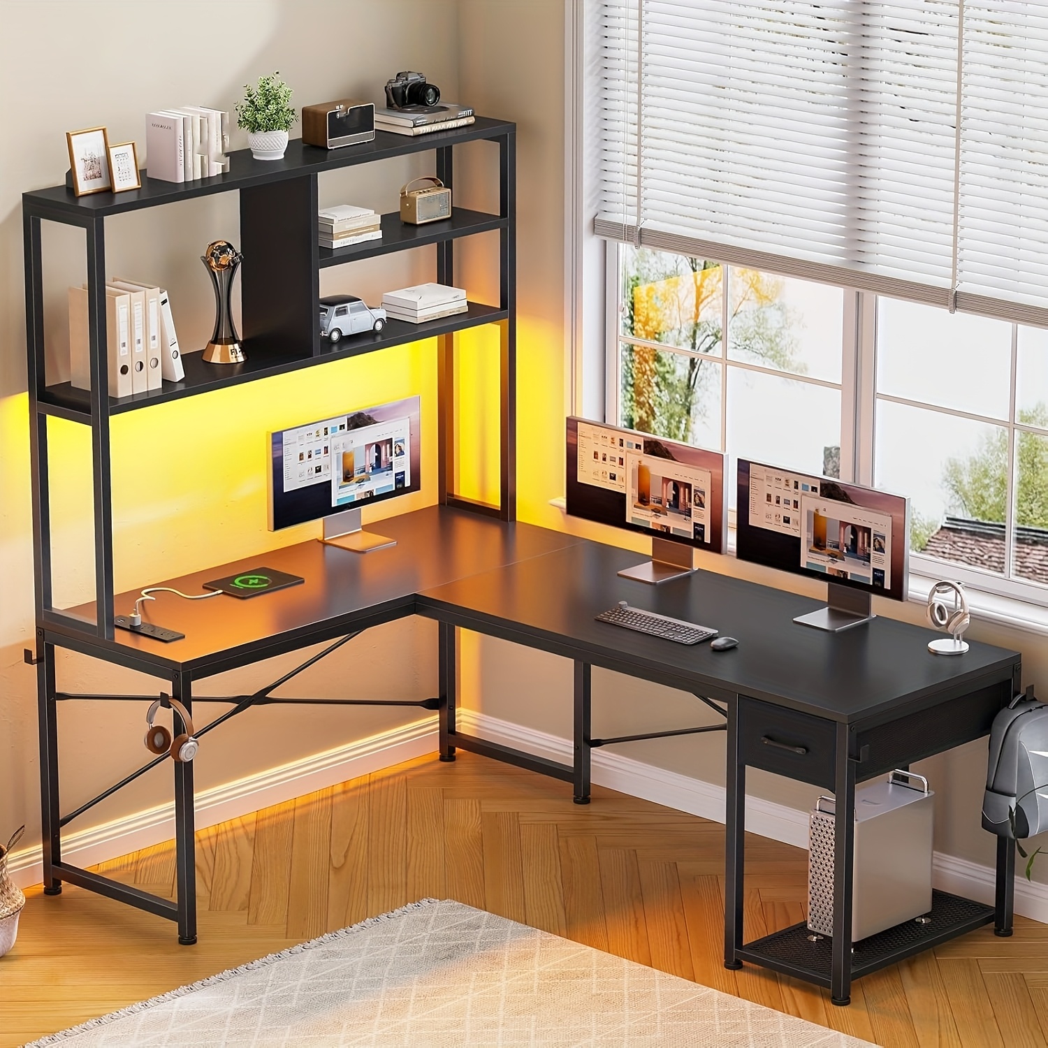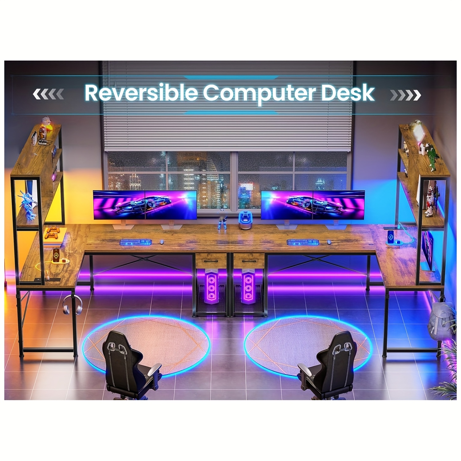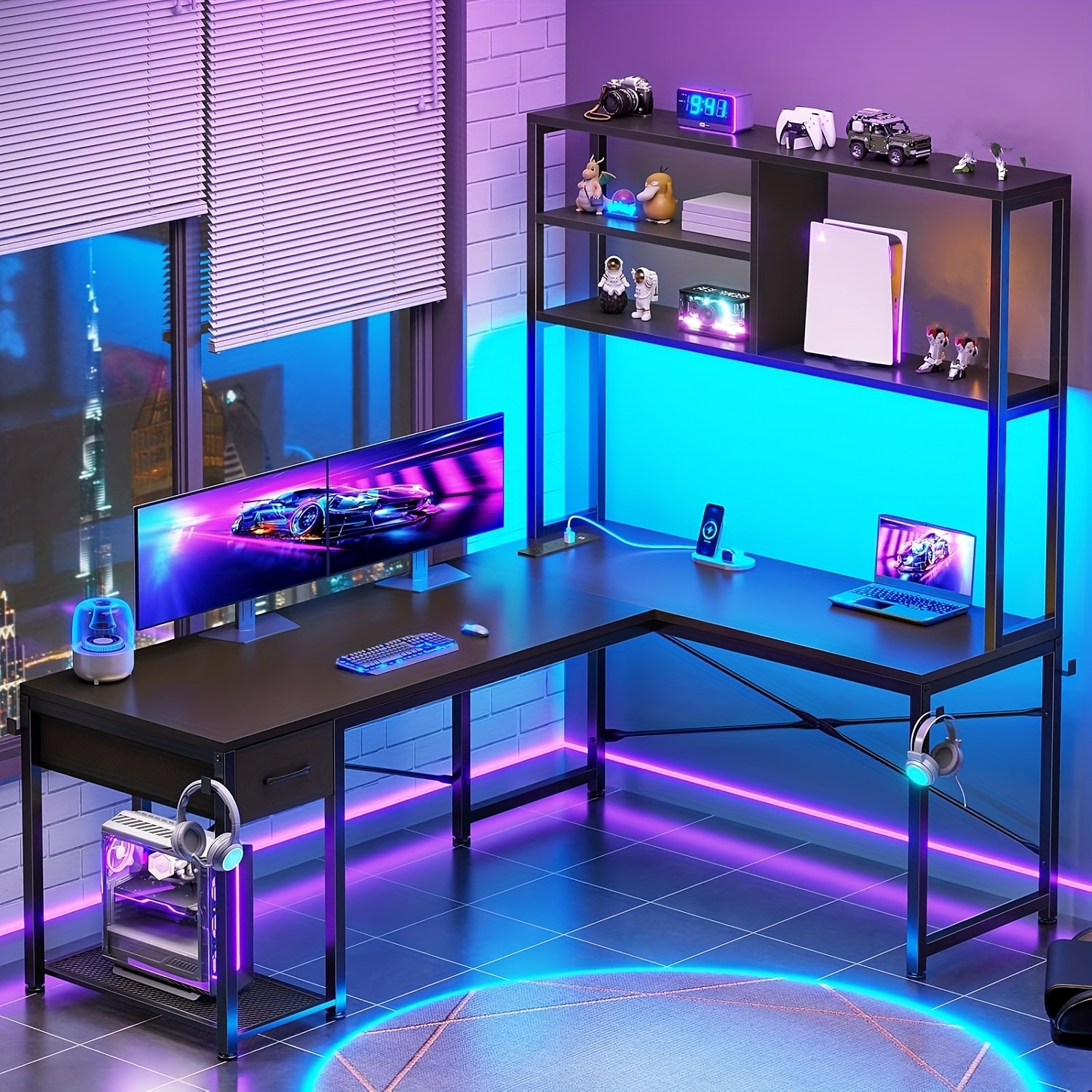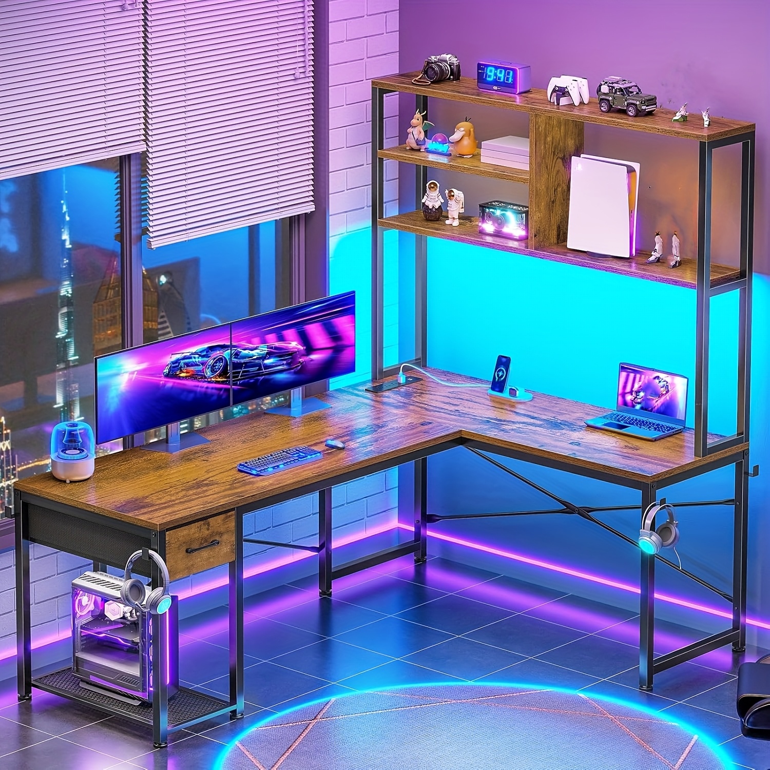 L Shaped Office Desk, 51.2″ Reversible Computer Desk with Drawer, LED Lights and Storage Shelves for Small Space