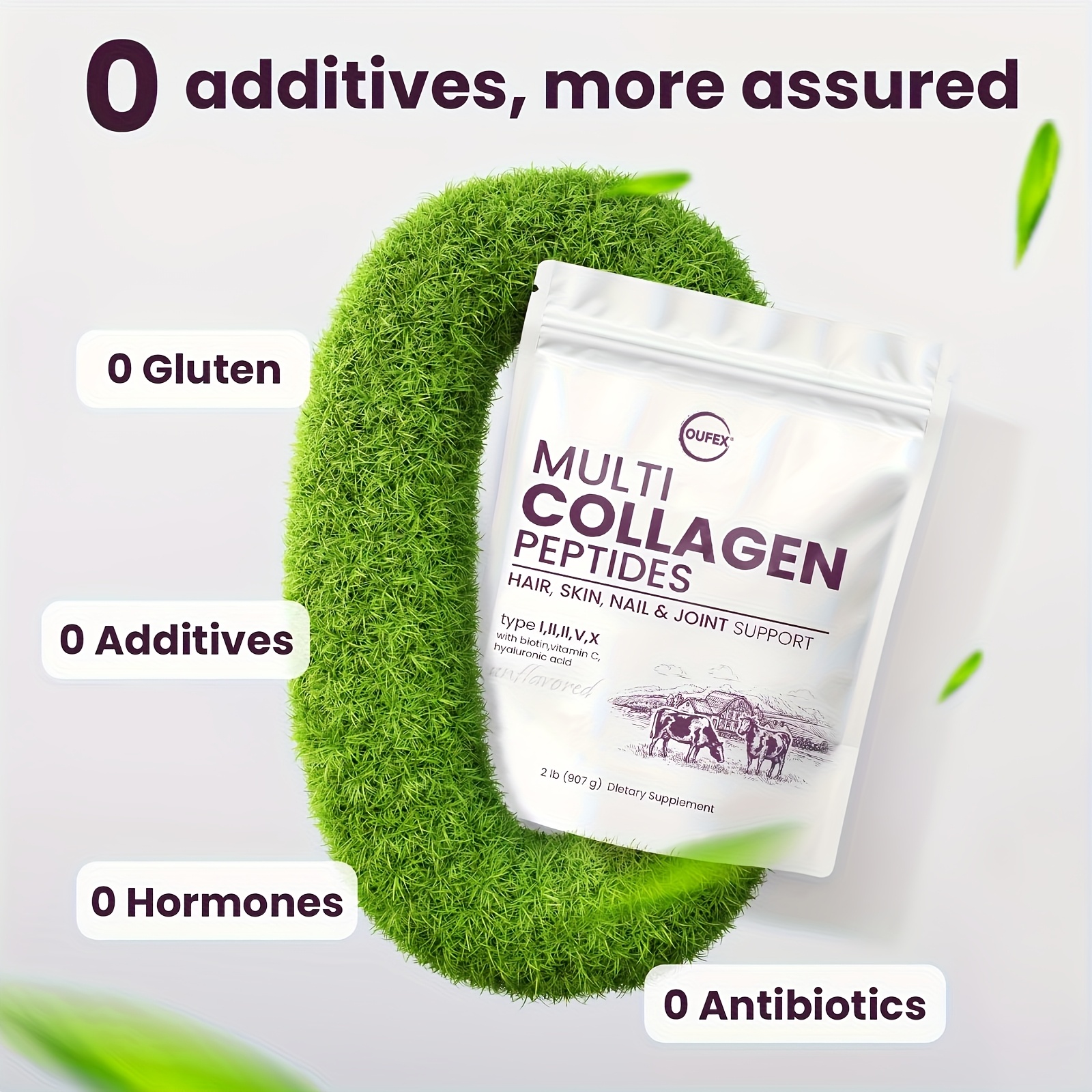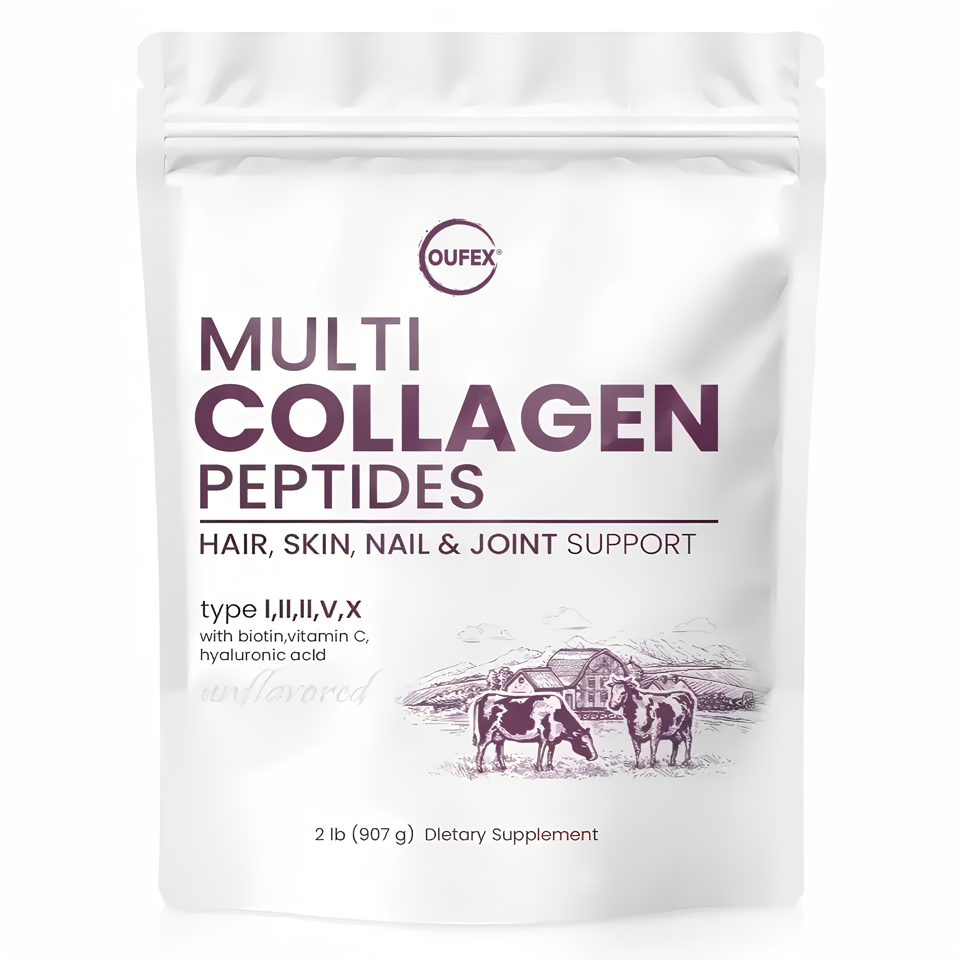 Oufex Multi-Source Collagen Peptides Powder – 2lb (907g) Dietary Supplement with Biotin, Vitamin C Acid for Hair, Light Beige, Nails & Joint Support – Natural Flavor, White Packaging, Collagen Supplement