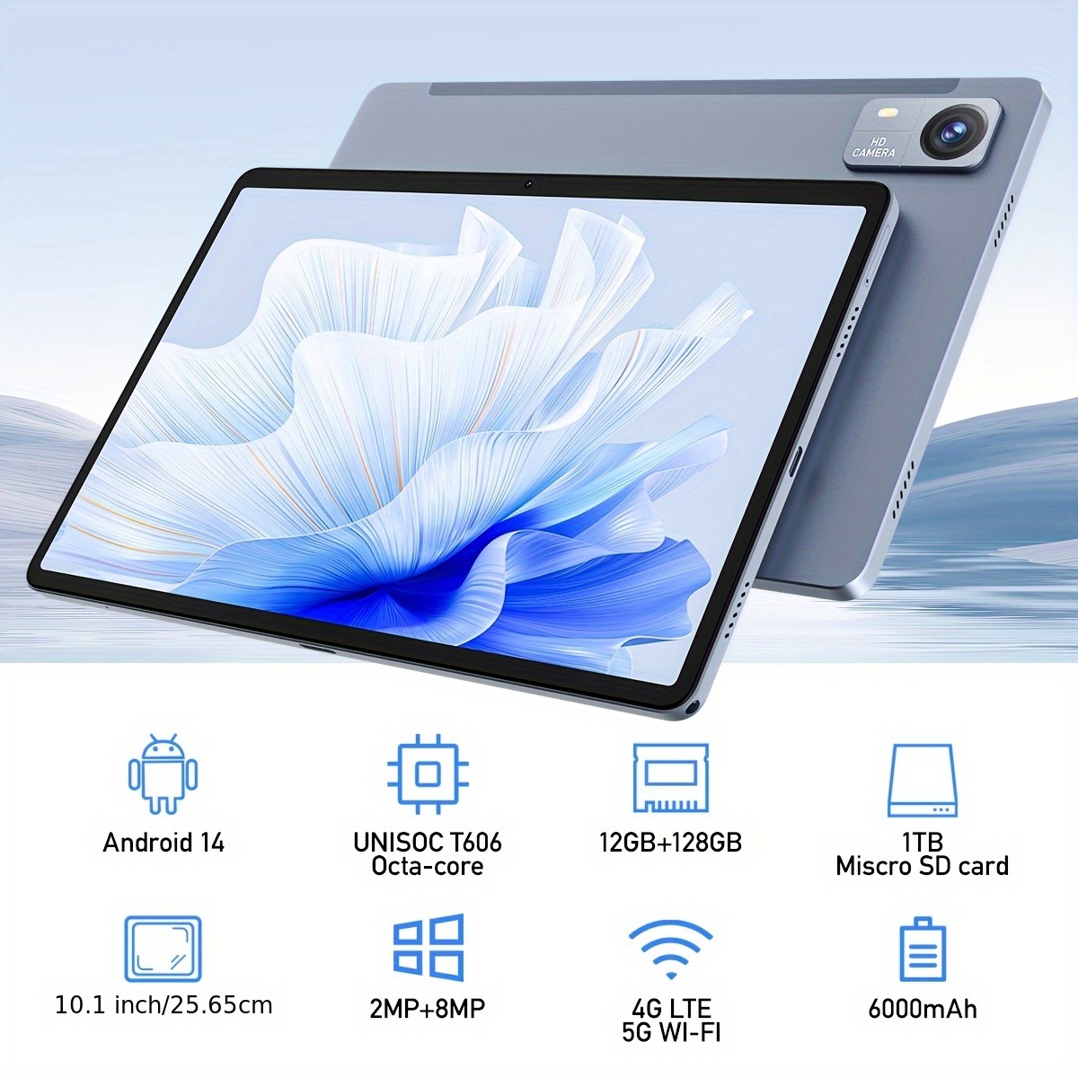 Tablet PC Android 14 4GLTE Support Dual SIM Card Calling 12GB ROM 128GB RAM 1TB Expandable Storage Micro SD Card Octa-core T606 Entertainment Office Gaming PC Computer Tablet 5Gwifi 10.1 Inch Incell 0.1S Face Recognition, Christmas New Year Free